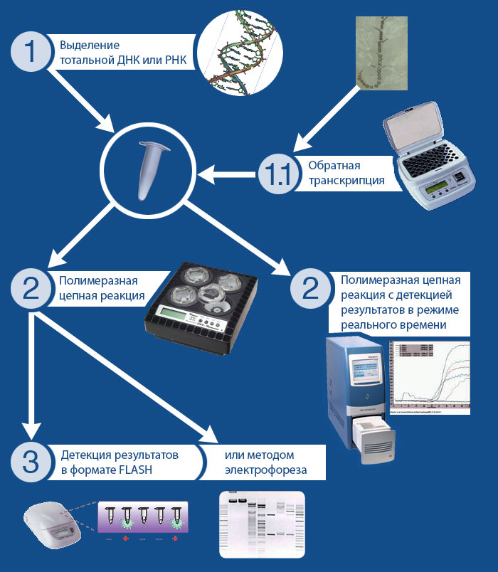В основе метода ПЦР лежит многократное удвоение целевого участка ДНК при помощи термостабильной ДНК-зависимой ДНК-полимеразы. В результате нарабатываются количества ДНК, достаточные для легкодоступного анализа. Важно, что происходит амплификация только того участка, который соответствует исследуемой (диагностируемой) последовательности ДНК, и только в том случае, если он присутствует в исследуемом образце.